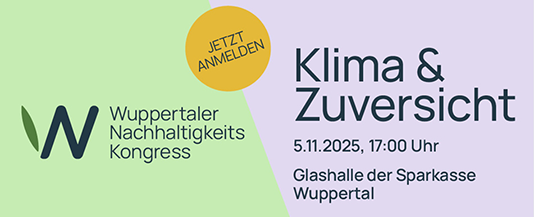 Die Sparkasse Wuppertal, die Neue Effizienz und das Wuppertal Institut laden alle Interessierten, die sich mit Fragen einer nachhaltigen, zukunftsfähigen Gesellschaft auseinandersetzen, zum diesjährigen Nachhaltigkeitskongress am 5. November 2025 nach Wuppertal ein. Unter dem Motto "Klima und Zuversicht" erwartet die Teilnehmenden ein spannendes Programm mit Vorträgen aus Wissenschaft, Praxis und Kultur.